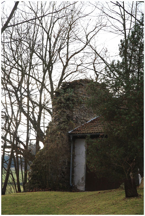 Pod ním jest dlouhý rybník řečený Tvrzský, do něhož z východní strany krátký ostroh podoby vejčité vybíhá. Na něm stojí nyní neveliká živnost, jejíž části přistavěny jsou ke starým zdem bývalé tvrze: bydlí zde knížecí baštýř. Na straně jižní jest nejdelší zeď, o kterouž se příbytek baštýřův opírá, jiné staré zdi nacházejí se při dvou menších vedlejších staveních. V jihozápadním úhlu příbytku jest ještě starý sklep. Na východní straně nacházela se podle podání pevná hradba a též brána, kteráž při poboření pádem svým jednoho zedníka z Budičovic zabila. Na místě tom nyní prázdném nalezly se hroty šípů a oštěpů již zrezovatělé. Pod tvrzištěm na východě jest sad níže než tvrziště, ale výše než hladina rybníka položený; na němž stávaly v 16. věku chlív dojník a nějaká světnice, z nichž ani dosti málo nezbylo. A poněvadž pod místem tím volně se sklánějícím zase rybník býval, stála celá tvrz ve vodě a mohlo se k ní jedině po hrázi rybníka Tvrzského přicházeti. Mezi tvrzištěm a ovčínem přišlo se prý na základní zdi bývalé vesnice.
